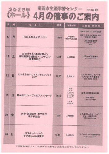 高岡市生涯学習センターの2026年(令和8年)4月のイベントカレンダーをアップします。