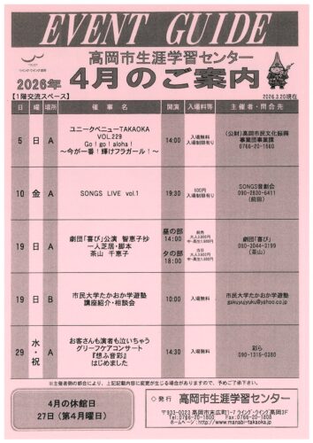 高岡市生涯学習センターEVENT GUIDE(2026年4月)[更新日] 2026-03-24