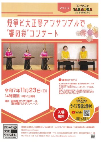 2025年(令和7年)11月23日(日)に、ユニークベニューTAKAOKA オン まちなかステージVol.217 、短筝と大正琴アンサンブルで”響の彩”コンサートを、御旅屋セリオ5階ホールで開催されます。