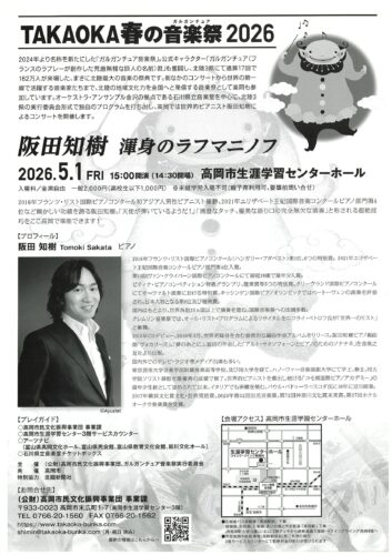 2026年(令和8年)5月1日(金)に、 TAKAOKA春の音楽祭2026 が、高岡市生涯学習センターホールで開催されます。