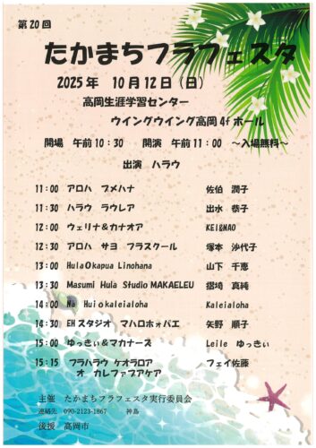 2025年(令和7年)10月12日(日)に、第20回たかまちフラフェスタが、高岡市生涯学習センター (ウイング・ウイング高岡)4階 ホールで開催されます。