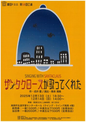 2025年(令和7年)12月13日(土)・14日(日)の2日間、劇団P.O.D.第58回公演「サンタクロースが歌ってくれた」が、高岡市生涯学習センター ホール(ウイング・ウイング高岡 4階)で開催されます。