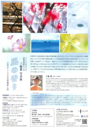 2025年(令和7年)11月1日(土)~2026年(令和8年)1月12日(月・祝)の間、三輪 薫 写真展「風の香り」-伊勢和紙プリント作品- が、ミュゼふくおかカメラ館で開催されます。