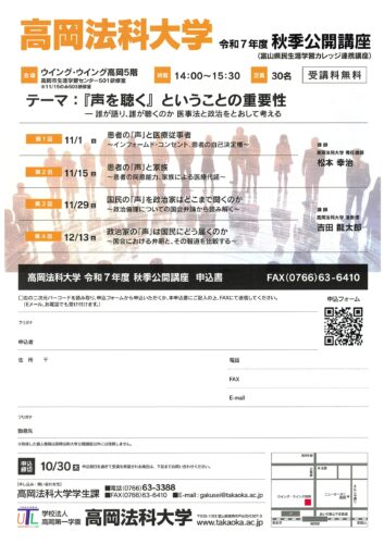 ということ2025年(令和7年)11月1日(土)~12月13日(土)の間、高岡法科大学 令和7年秋季公開講座 -『声を聴く』ということの重要性 -誰が語り、誰が聴くのか 医事法と政治をとおして考える(全4回)が、高岡市生涯学習センター5階 501研修室(11/15のみ 503研修室)で開催されます。