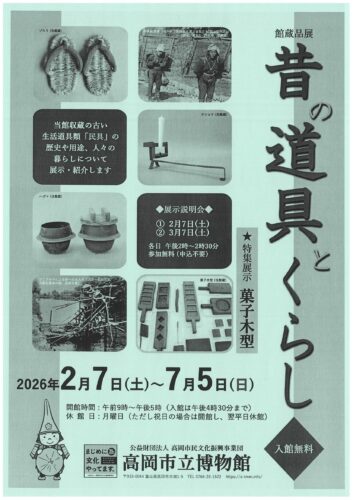 2026年(令和8年)2月7日(土)~7月5日(日)の間、館蔵品展「昔の道具とくらし」が、高岡市立博物館にて開催されます。
