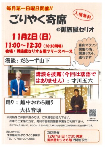 11月のごりやく寄席@御旅屋セリオ、出演は、漫談だらーず山下、講談才川五六(落語ではありません)、越中おわら踊り 命和会、大仏音頭 薫会 の出演・演目を予定していますで、お楽しみに!!