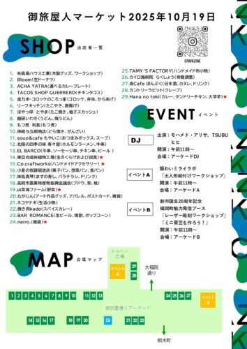 2025年(令和7年)10月19日(日)に、暮らすまちを、知る。暮らすまちに、問う。御旅屋人(おたやじん)マーケットが、御旅屋通り、御旅屋メルヘン広場などを会場に開催されます。
