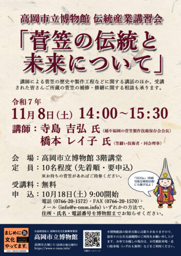 2025年(令和7年)11月8日(土)に、伝統産業講習会「菅笠の伝統と未来について」が、高岡市立博物館で開催されます。
