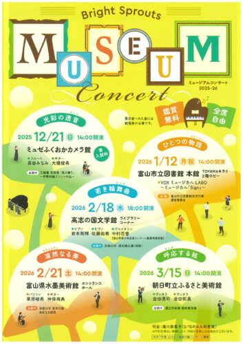 身近なアート空間で富山ゆかりの音楽家たちが演奏する「ミュージアムコンサート」、鑑賞ご希望の方は、開催当日 ミュゼふくおかカメラ館まて、ご参集ください。