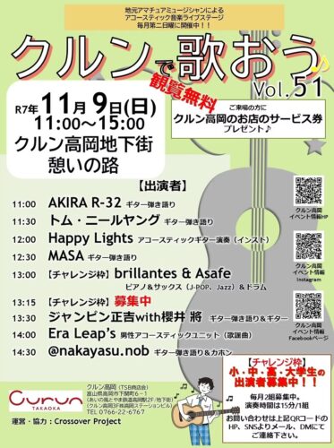 2025年(令和7年)11月9日(日)に、アコースティック音楽ライブ『クルンで歌おう♪』Vol.51が、クルン高岡 地下街 憩いの路 で開催されます。※11月~3月 クルン高岡地下街 憩いの路に会場変更となります。