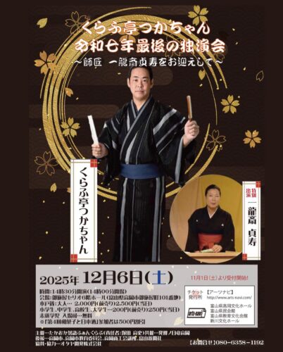 2025年(令和7年)12月6日(土)に、くらふ亭つかちゃん 令和七ねん最後の独演会 ~師匠 一龍斎貞寿をお迎えして~ が、御旅屋セリオ 6階フリースペース 特設会場で開催されます。