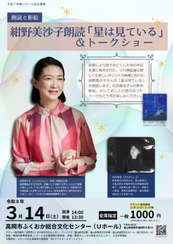 2026年(令和8年)3月14日(土)に、令和7年度Uホール自主事業 紺野美沙子朗読「星は見ている」& トークショー が、高岡市ふくおか総合文化センター(Uホール)で開催されます。