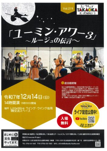 2025年(令和7年)12月14日(日)に、ユニークベニューTAKAOKA オン まちなかステージ Vol.219 「ユーミン・アワー3」~ルージュの伝言~、遊民唄歌隊は、日本を代表する女性アーティストであるユーミンこと松任谷由美さんが、独身時代「荒井由美」として発表した今も色あせぬ名曲を中心に、2008年から演奏活動を続けて今年18年目となる世代越え音楽集団です。