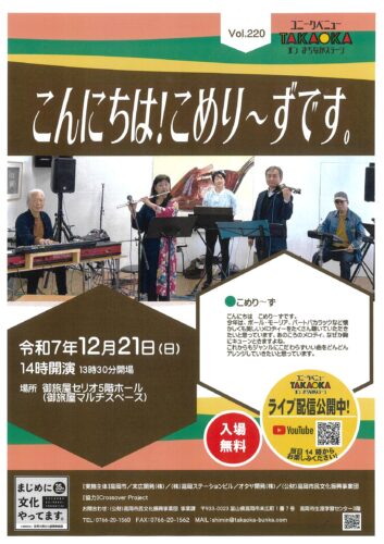 2025年(令和7年)12月20日(日)に、ユニークベニューTAKAOKA オン まちなかステージ Vol.220「こんにちわ!こめり~ずです。」開催