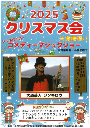 2025年(令和7年)12月13日(土)に、ウイング・ウイング 2025 クリスマス会が、Little Wing(ウイング・ウイング高岡 1階交流スペースA)にて開催されます。