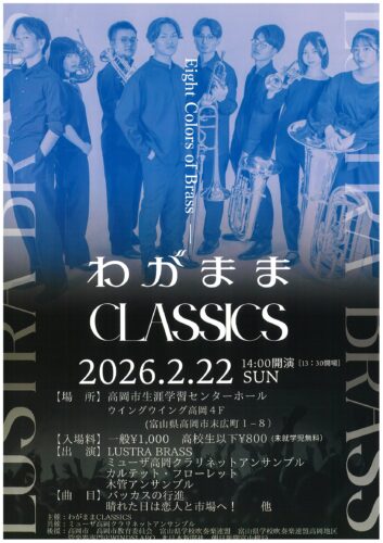 2027年(令和8年)2月22日(日)に、高岡市生涯学習センターホールウイングウイング4Fにて、わがままCLASSICSが開催されます。