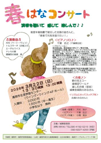 2026年(令和8年)3月22日(日)に、春はなコンサートをピアノソロ:千葉 広之、合唱:野の花エコー、楽唱団ワールド、楽しむ合唱、城東音楽院のみなさんで、リズムにのってステップを会場のみなさんと行われます。