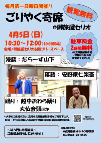 2026年(令和8年)4月5日(日)に、ごりやく寄席@御旅屋セリオを 御旅屋セリオ6階フリースペースで開催します。