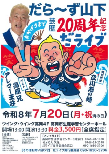 2026年(令和8年)7月20日(月・祝)に、だらーず山下 おかげさまで芸歴20周年記念だライブをウイング・ウイング高岡4F 高岡市生涯学習センターホールにて行います。