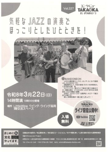 2026年(令和8年)3月22日(日)に、ユニークベニューTAKAOKA オン まちなかステージ Vol.227 気軽なJAZZの演奏でほっこりとしたひとときを!がお届けします!