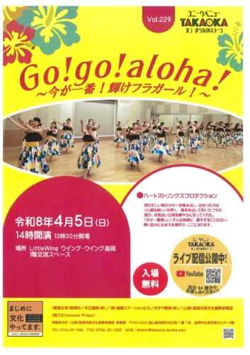 2026年(令和8年)4月5日(日)に、ユニークベニューTAKAOKA オン まちなかステージ Vol.229Go!go! aloha! 今が一番!輝けフラガール をハートストリングスプロダクションが届けします!