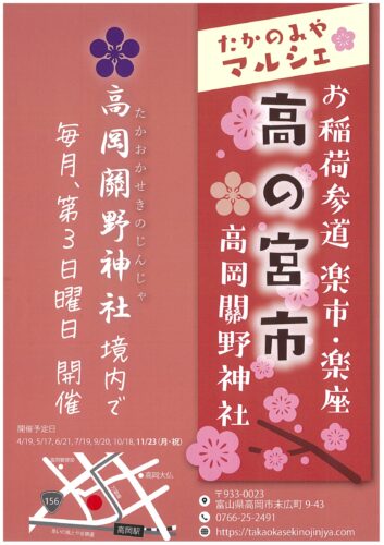 2026年(令和8年)4月19日(日)に、お稲荷参道 楽市・楽座高の宮市が高岡關野神社で開催されます。