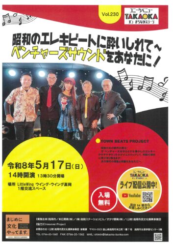 2026年(令和8年)5月17日(日)に、ユニークベニューTAKAOKA オン まちなかステージ Vol.230 昭和のエレキビートに酔いしれて~
